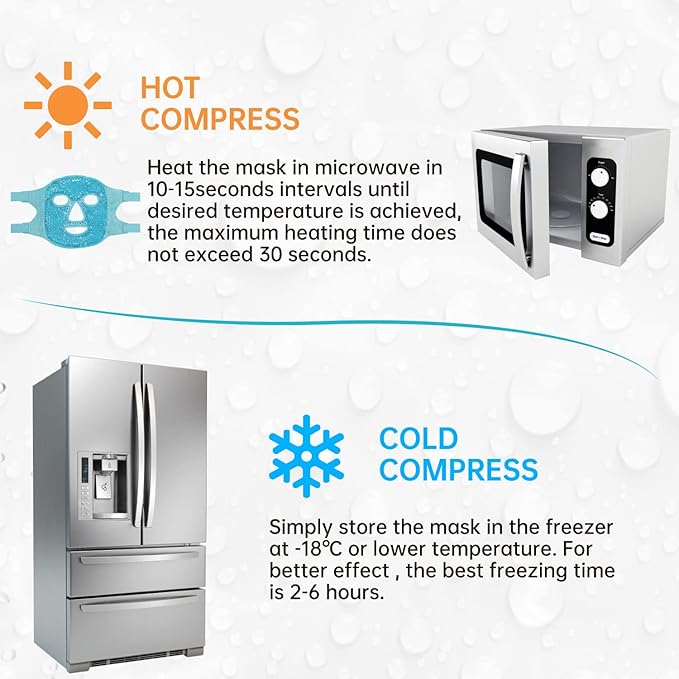 - 【CONVENIENT TO USE】simply store the mask in the freezer at -18℃ or lower temperature for at least 2 hours. Heat the mask in microwave in 10-15seconds intervals until desired temperature is achieved,the maximum heating time does not exceed 30 seconds.