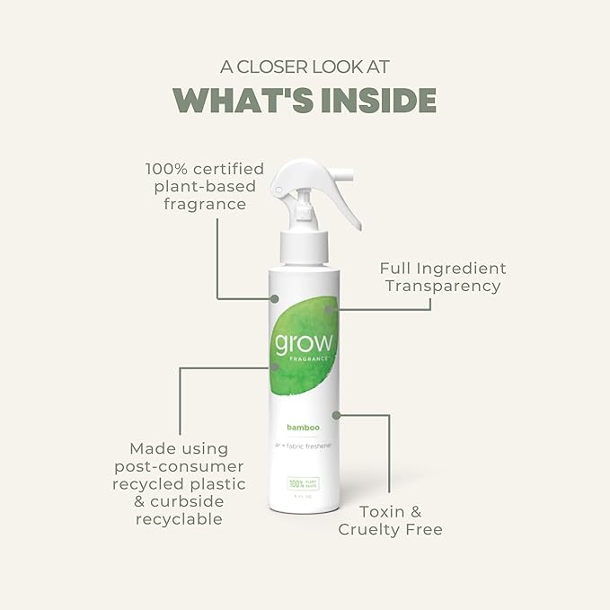 - Scents Crafted In Small Batches: We craft each spray with a unique mix of essential oils and plant extracts sourced from flowers, herbs, and botanicals. Every spritz offers a touch of luxury in any room. Bamboo: Feel transported to a tranquil bamboo forest with our refreshing Bamboo scent, evoking feelings of pure calm and serenity. Enjoy the beautiful scents of nature, knowing you're bringing only the best into your home with Grow Fragrance.