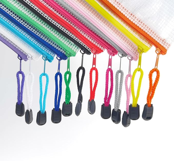 - 12Pcs Mesh zipper bags with label pocket, Receipt size 9.2x4.1 inch. Widely used in Office Home Hospital and Travel. Great zipper file bags, board game storage bags, pencils pouches, puzzles bags, cross stitch projects bags or keeping various craft projects organized. These mesh bags could meet your needs in all ways