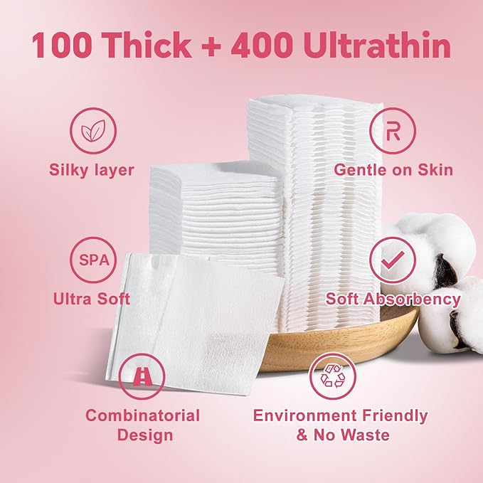 - Thick And Thin: Receive 100 thick cotton pads for makeup removal and 400 ultrathin soft pads for light skincare like toners and serums