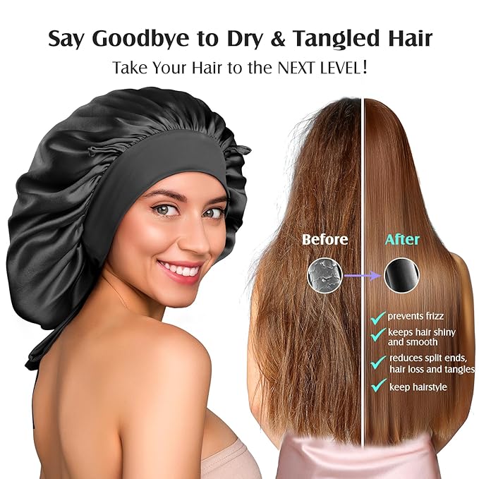 - Adjustable Tie & Secure Loop - Stay on Head ALL NIGHT: our silk hair bonnets for sleeping long hair are designed with an elastic band (premium polyester) and fixed anti-fall loops on both sides of the forehead, allowing you to adjust its fit or fashion a decorative bow or and secure the bow. Regardless of your nighttime movements, this silk sleeping bonnet remains securely in place. Stretchy long band - wide soft, high elastic and skin friendly, wouldnot make you feel tight and leave imprint on head and much more cosy