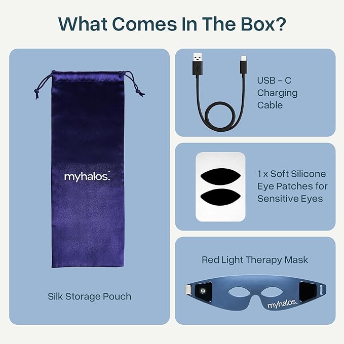 - Why MyHalos? - With 850nm NIR red light under eye therapy, MyHalos delivers superior results through high irradiance LEDs. Unlike other brands that use low-power LEDs, our red light eye therapy offers effective penetration, adjustable straps, and safety features like auto shut-off, plus eye patches for sensitive eyes.