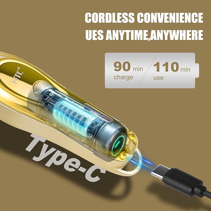 HTC Hair Clippers – Professional Cordless Rechargeable Hair Trimmer with Precision, Adjustable Speeds, and LED Display (Gold)