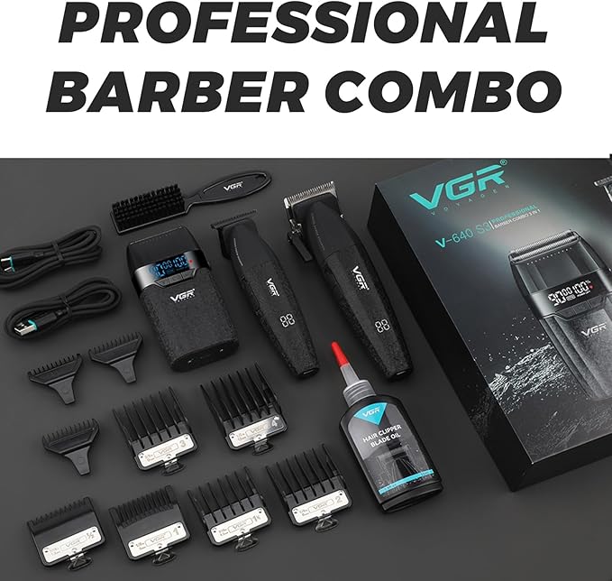 - ALL-IN-ONE PROFESSIONAL GROOMING KIT:The VGR640S3 includes a powerful clipper, a precision trimmer, and a foil shaver—perfect for a complete grooming experience. Comes with 6 clipper guards (1.5–12mm), 3 trimmer guards (1–3mm), lubricating oil, cleaning brush, protective covers, and a charging cable. The clipper’s adjustable taper lever offers 5 trimming lengths, while the shaver ensures a smooth, clean finish. Ideal for barbers or at-home users seeking salon-quality results