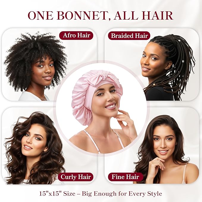 - All Hair Types Covered: This double-layer silky bonnet is designed for sleeping women to help protect curly, straight, coily, and wavy hair during sleep or after a shower. Whether your hair is long, short, thin, or thick, this large sleep bonnet help reduce frizz, tangles, and breakage, making it ideal for curly hair or braids.
