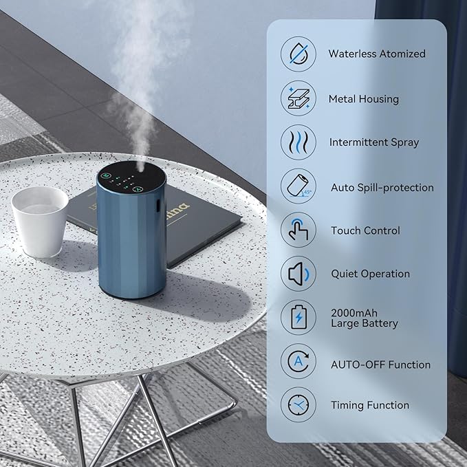 Waterless Essential Oil Diffuser Aromatherapy Scent Diffusers for Home Large Room, Bedroom, Car, Office, Desk, Battery Operated Mini Portable Air Freshener (Blue)