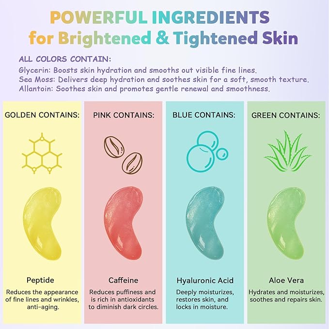 - The Ultimate 8-Color Under Eye Patches Experience: Why settle for one when you can try them all? The MASKISS 8-pack eye mask set features eight vibrant colors, each powered by a unique active ingredient—from caffeine and retinol to hyaluronic acid, niacinamide, ceramides, and more. Perfect for discovering what your skin loves most.